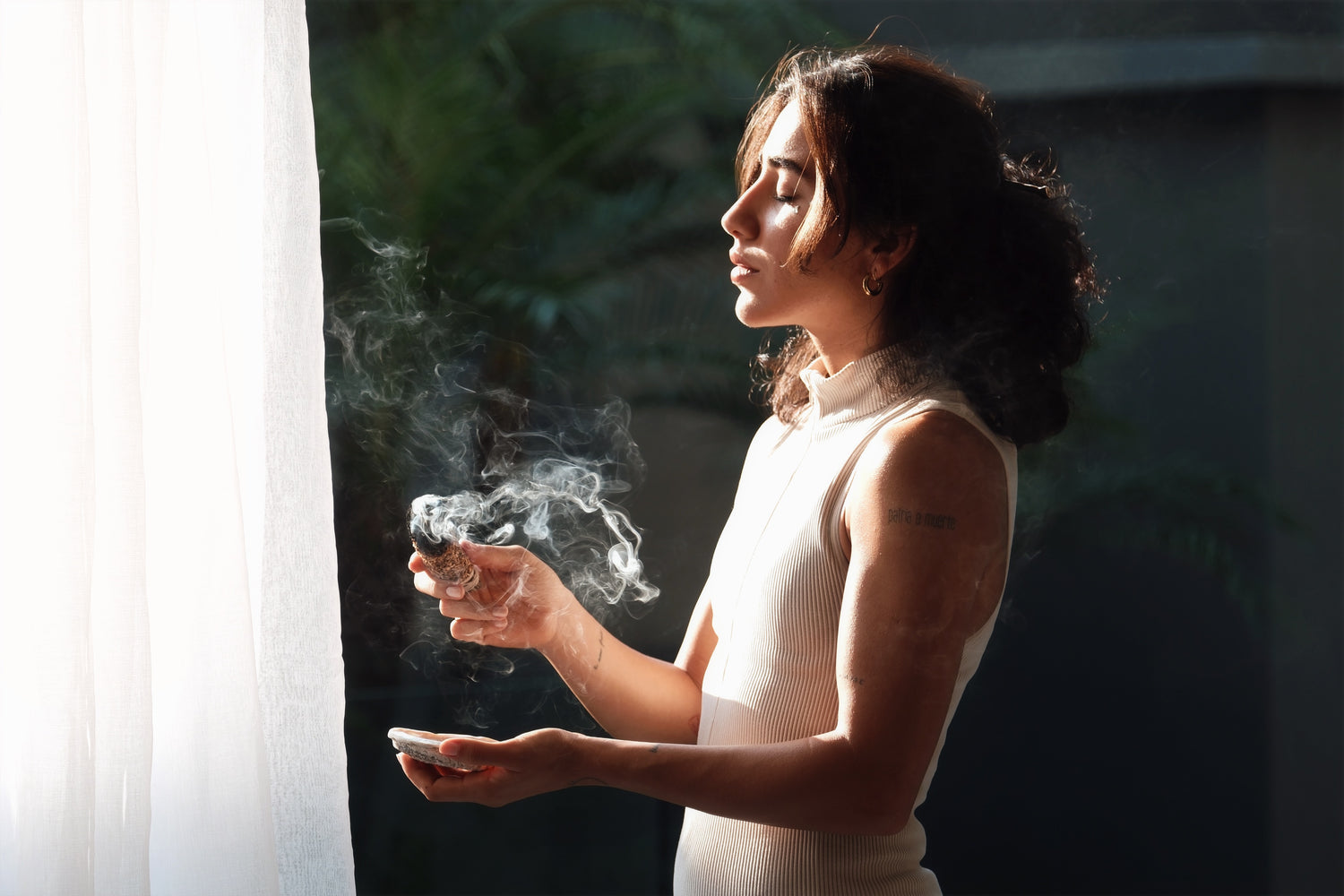 Allumez l'extrémité du bâton, laissez-le se consumer légèrement, puis soufflez doucement pour diffuser la fumée.